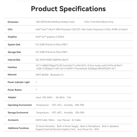 Recursos Funcionais 🏆【Poderoso processador Intel® Core™ Ultra 9 185H e GPU Intel® Arc™ Graphics permitem que você entre com confiança em um ambiente de trabalho com IA!】---CPU, GPU e NPU em um único chip. A nova aceleração de IA e o traçado de raios por hardware transformarão completamente sua experiência em multitarefas no escritório, jogos com gráficos intensivos e computação local com IA. 🏆【Interação por Voz com IA e Captação Omnidirecional de 360°】---O microfone embutido é alimentado por um chip de IA que suporta captação inteligente de áudio, permitindo separar com eficácia os comandos de voz do ruído de fundo. Ele também oferece reconhecimento de voz sem barreiras em 360° dentro de um raio de 5 metros, o que permite realizar videoconferências sem sair do lugar. Os alto-falantes são aprimorados com DSP e um amplificador profissional, oferecendo som encorpado com agudos brilhantes, vocais realistas e riqueza de detalhes. 🏆【Operação Quase Silenciosa de 32dB】---A entrada de ar pela parte inferior é tão eficiente na dissipação de calor que o GTi14 Ultra necessita de uma velocidade de ventilador muito baixa para manter-se frio e estável com 65W TDP, garantindo operação quase silenciosa. Como não há saídas de ar nas partes superior e laterais, o GTi14 Ultra agora conta com um design mais limpo e moderno. 🏆【Alto-falantes Embutidos】---O sistema de alto-falantes duplos proporciona um som rico e completo, oferecendo uma experiência de áudio imersiva. 🏆【Fonte de Alimentação Interna de 145W】---Fonte de alta potência permite desempenho elevado contínuo e operação estável com 65W TDP. 🏆【Compatível com Placa de Vídeo Externa】---A interface PCIe 5.0 x8 permite que a eGPU atinja seu máximo desempenho, multiplicando sua produtividade! 🏆【Sensor de Impressão Digital】---Compatível com login rápido e seguro e criptografia de arquivos. Consulte a documentação oficial do Windows para mais detalhes. 🏆【RAM e Armazenamento Expansíveis】---O GTi14 Ultra suporta memória RAM DDR5 de canal duplo a 5600MHz com até 96GB. Também possui dois slots SSD M.2 2280 PCIe 4.0, com suporte para até 8TB de armazenamento interno rápido e W11PRO pré instalado. 🏆【Design Antipoeira Ultra Prático】---O novo filtro de malha na parte inferior impede a entrada de poeira no GTi14 Ultra, evitando acúmulo de sujeira e problemas relacionados à poeira.